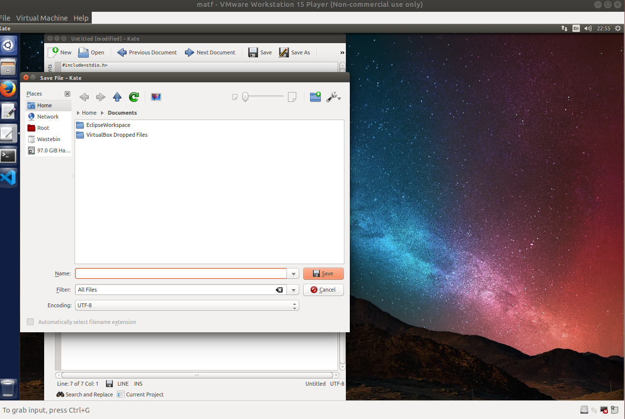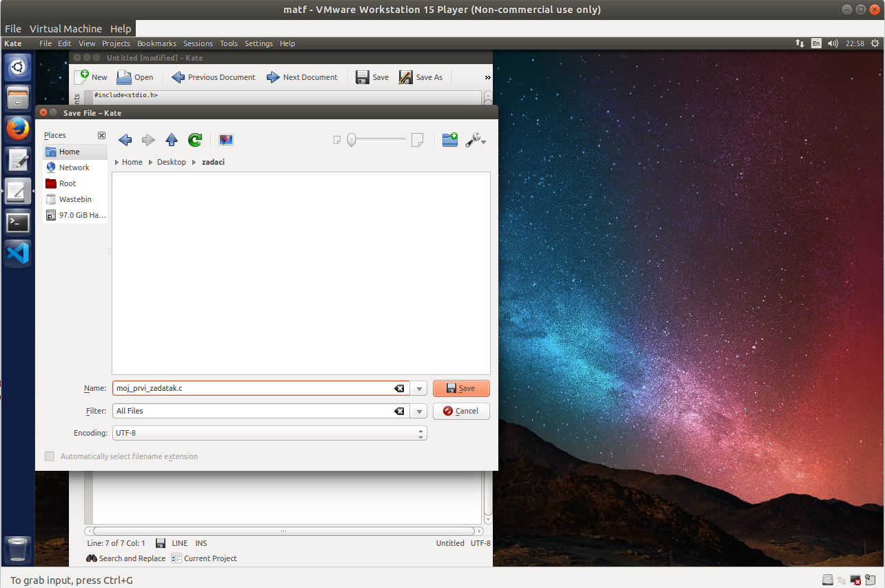 Nakon što ste otkucali svoj C program, neophodno je da ga pravilno sačuvate. Sistem upravljanja dokumentima u operativnom sistemu Linux razlikuje se od onog pod Windows-om, što prevazilazi namenu ovog uputstva. Daćemo objašnjenje za jedan slučaj: kako sačuvati C program na Desktopu unutar direktorijuma zadaci. To možemo uraditi na sledeći način: nakon klika na "Save As", otvoriće vam se ovakav prozor:
