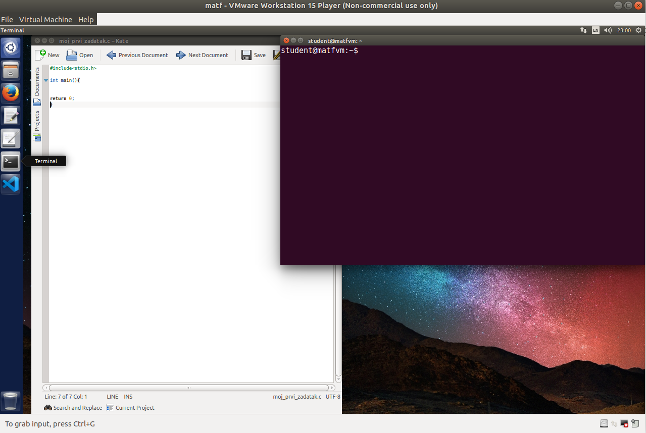 Nakon toga možete pristupiti prevođenju i pokretanju vašeg programa. Najpre treba pokrenuti "Terminal", koji se isto kao "Kate" nalazi u "Launcher Bar-u" u levom delu ekrana:
