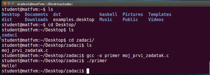 Potom, kada se "Terminal" otvori, potrebno je zadati sledeće komande. Komandu za pokretanje programa ./primer zadajete samo ukoliko prilikom prevođenja nije bilo grešaka! U suprotnom, neophodno je da se vratite u editor, ispravite greške i ponovo prevedete program.